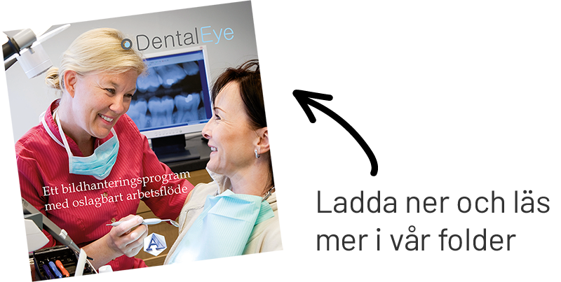 När vi började skapa DentalEye 1992 studerade vi hur tandvården arbetar. Vi upptäckte att till skillnad från många andra sitter inte tandläkare framför en dator, utan har datorn vid sidan om och patienten i fokus. Vi har anpassat DentalEye till tandläkarnas arbetssätt. Du behöver oftast inte röra datorn för att ta röntgenbilder. Välj bara mall, positionera sensorn och exponera så hamnar alla bilder rättvända i rätt position och får all anatomisk information på köpet. Du har de senast tagna bilderna på bildkortet framför dig. I listan till vänster finns alla tidigare bildkort på patienten utan att du behöver söka efter dem. Jämför nya och gamla bildkort tillsammans med ett knapptryck.