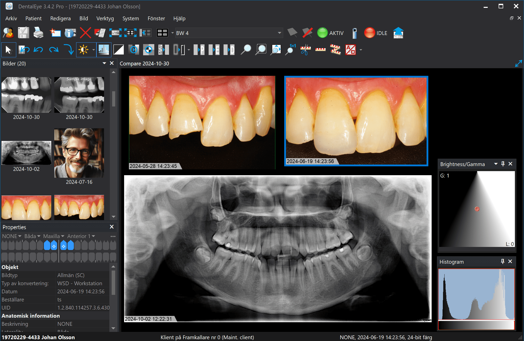 När vi började skapa DentalEye 1992 studerade vi hur tandvården arbetar. Vi upptäckte att till skillnad från många andra sitter inte tandläkare framför en dator, utan har datorn vid sidan om och patienten i fokus. Vi har anpassat DentalEye till tandläkarnas arbetssätt. Du behöver oftast inte röra datorn för att ta röntgenbilder. Välj bara mall, positionera sensorn och exponera så hamnar alla bilder rättvända i rätt position och får all anatomisk information på köpet. Du har de senast tagna bilderna på bildkortet framför dig. I listan till vänster finns alla tidigare bildkort på patienten utan att du behöver söka efter dem. Jämför nya och gamla bildkort tillsammans med ett knapptryck.